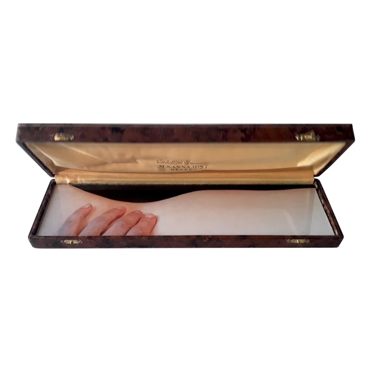 Le travail qui se développe au travers de la série des « Boites » consiste à montrer des photographies qui révèlent une certaine intimité sans pour autant les offrir directement au regard. Les photographies, protégées par le verre, sont placées à la surface de la boite. Il persiste ainsi un espace secret sous la photographie de telle sorte que l’intimité dévoilée demeure finalement pour une part inaccessible. Chaque boite est différente par sa taille, sa couleur, sa matière et sa provenance, aucune ne semble dotée de qualités particulières cependant toutes sont porteuses d’une histoire. Les photographies présentent des fragments de corps où très souvent une main apparaît, féminine ou masculine. Effleurements, caresses, ces gestes en suspens, mis en espace, entre parenthèses, révélateurs d’une relation affective et empreints de sensualité ont besoin d’un cadre et d’une protection pour pouvoir apparaître au grand jour. La boîte peut soit être ouverte, soit rester close, le spectateur choisit de s’en saisir ou décide de laisser l’histoire en attente. Il peut en garder la jouissance pour lui seul ou bien l’offrir au regard de l’autre.